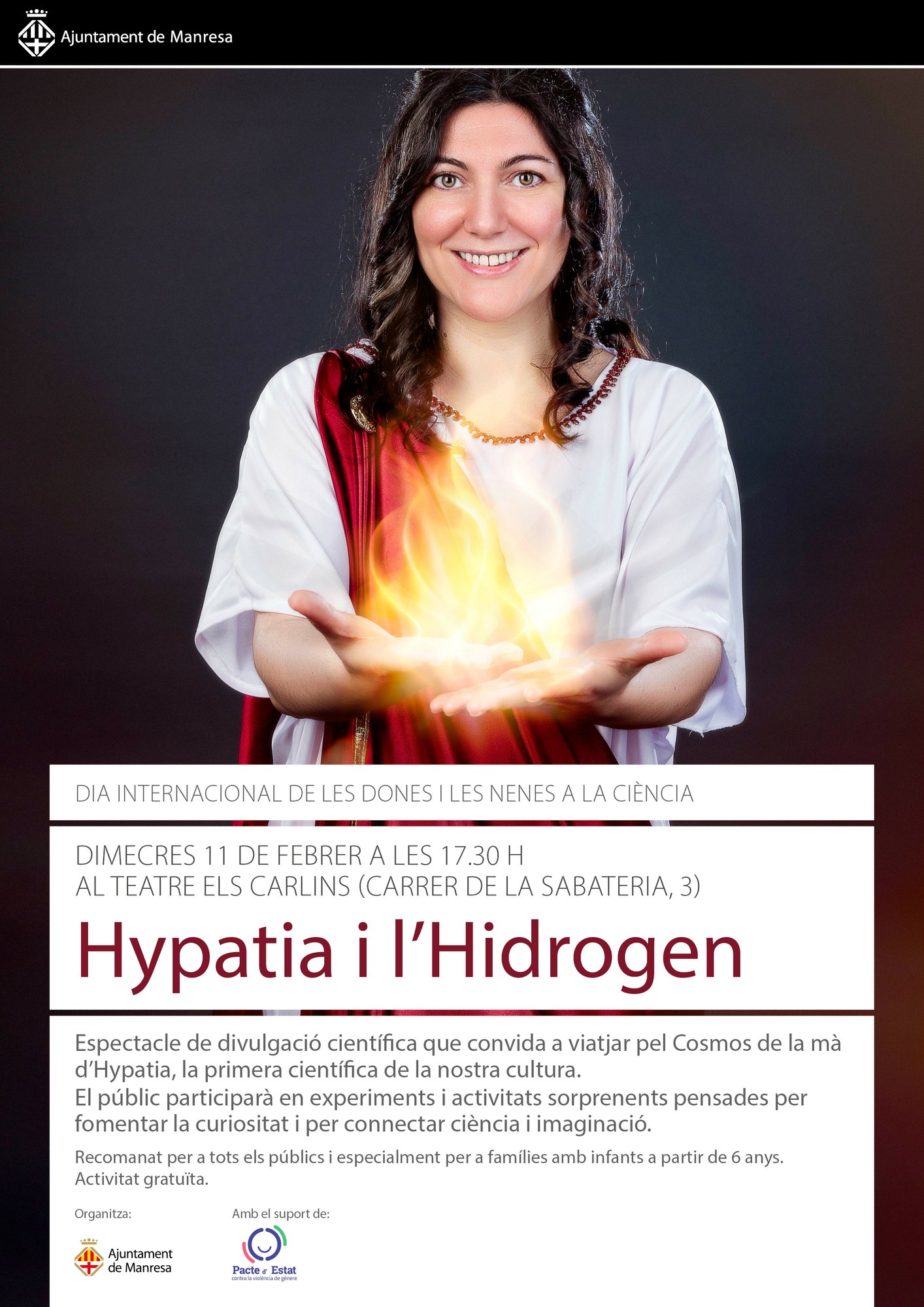 Amb motiu del Dia Internacional de les Dones i les Nenes a la Ciència, l’Ajuntament de Manresa presenta Hypatia i l’Hidrogen, un espectacle de divulgació científica que convida a viatjar pel cosmos amb la primera científica de la nostra cultura. El públic participarà en experiments senzills i sorprenents sobre l’hidrogen, dissenyats per despertar la curiositat i connectar ciència i imaginació. Recomanat per a tots els públics i famílies amb infants a partir de 6 anys.