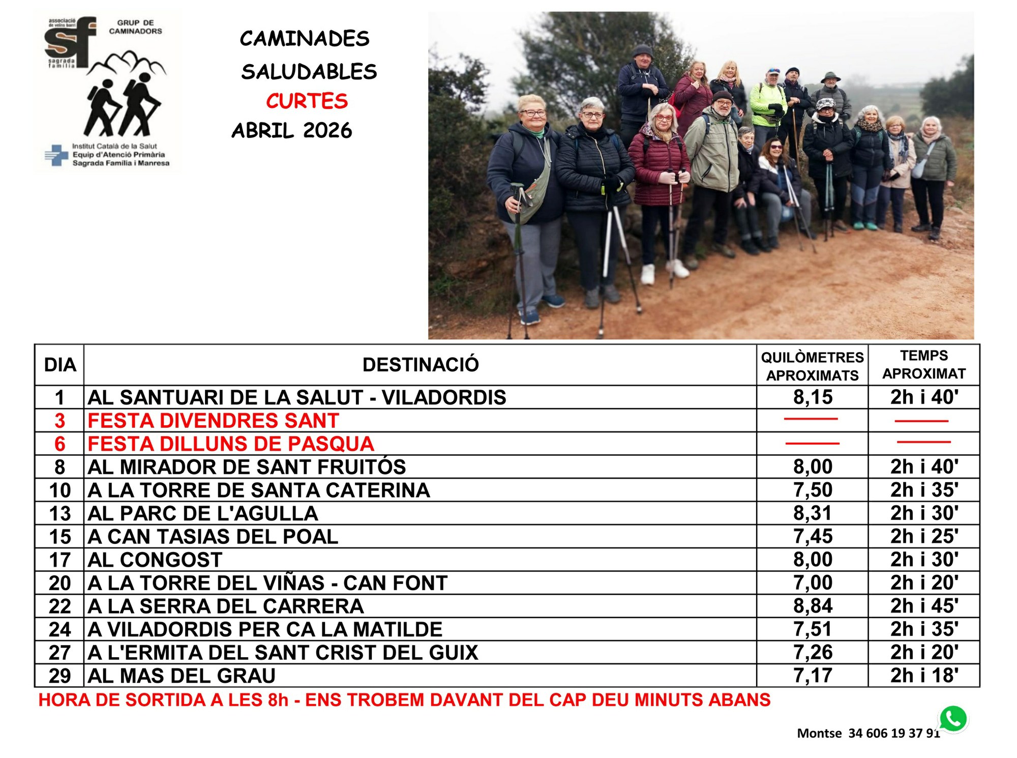 Les curtes, de 7 a 9 km . El punt de trobada és davant del CAP Sagrada Família, a les 7.50 h, per sortir a les 8.00h